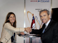 En la fotograf? aparece la Directora Ejecutiva de Communicor - Global Corporate Transportation, Marta Ferreira, saludando al Director Ejecutivo de FIDAE 2012, Comandante de Grupo (A), Jean Pierre Desgroux Ycaza. |